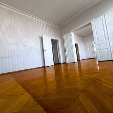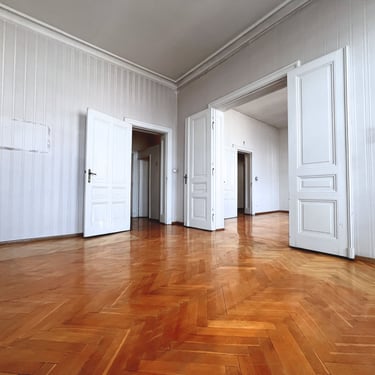 Dwuskrzydłowe drzwi, ogromna przestrzeń, przepiękny widok i wysokość pomieszczeń sięgająca 3,55 metra to cechy niespotykane w dzisiejszym budownictwie.